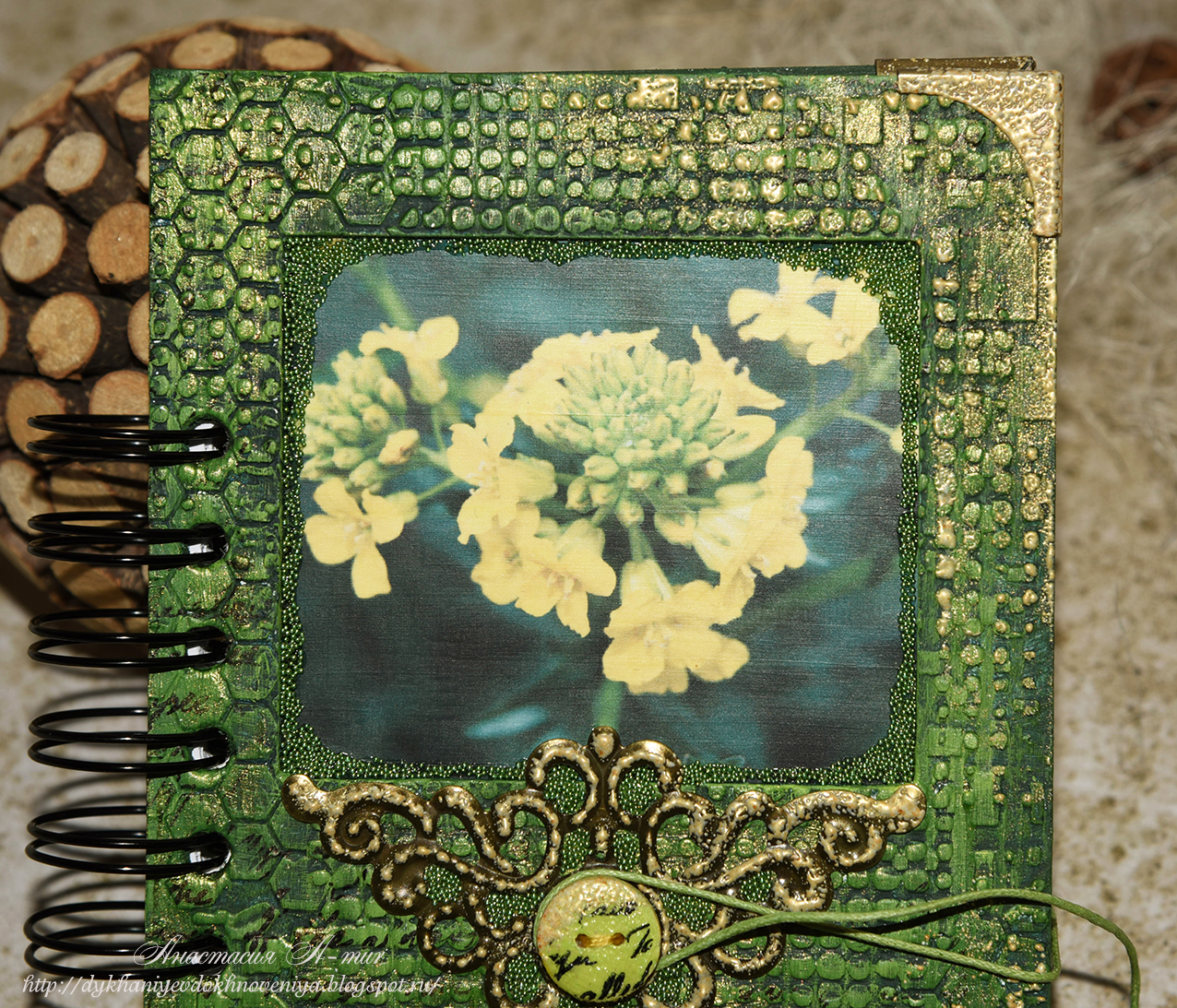 Хорошо просушиваем заготовки, вклеиваем картинку в окошко (22), и приклеиваем вторую заготовку обложки. Т.е. у нас получается две заготовки из пивного картона, между которыми вклеена картинка, а заготовки склеены между собой. Заднюю обложку я тоже склеиваю из двух частей, чтоб по толщине наши обложки были одинаковые и хорошо смотрелись. На этом этапе прокрашиваем торцы и немного оборотную сторону обложки. Теперь переходим к дальнейшему декору (23). Я немного прошлась перламутровыми красками зеленой и золотой и штампом-рукописный текст. Сделала эмбоссинг пудрой светлое золото. Я буду использовать металлические уголки для защиты углов, и буду их эмбоссить золотой пудрой и что бы объединить их со всем блокнотом делаю эмбоссинг и на обложке, и на металлическом украшении, которое использую для декора, и на пуговичке. Пуговичку декорировала сама: покрасила в нужный цвет, поставила штам рукописный текст, добавила немного эмбоссинга. Приклеиваю декор к обложке.