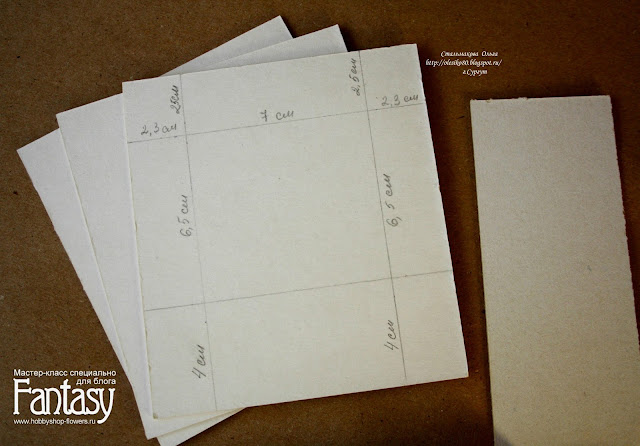 3. Теперь берём один прямоугольник и отмечаем размеры (можно прям как у меня чертить карандашом, всё равно эти отметки скроются за бумагой). По горизонтали 2,3 см + 7 см + 2,3 см и по вертикали 2,5 см + 6,5 см + 4 см (получилось окошечко)....